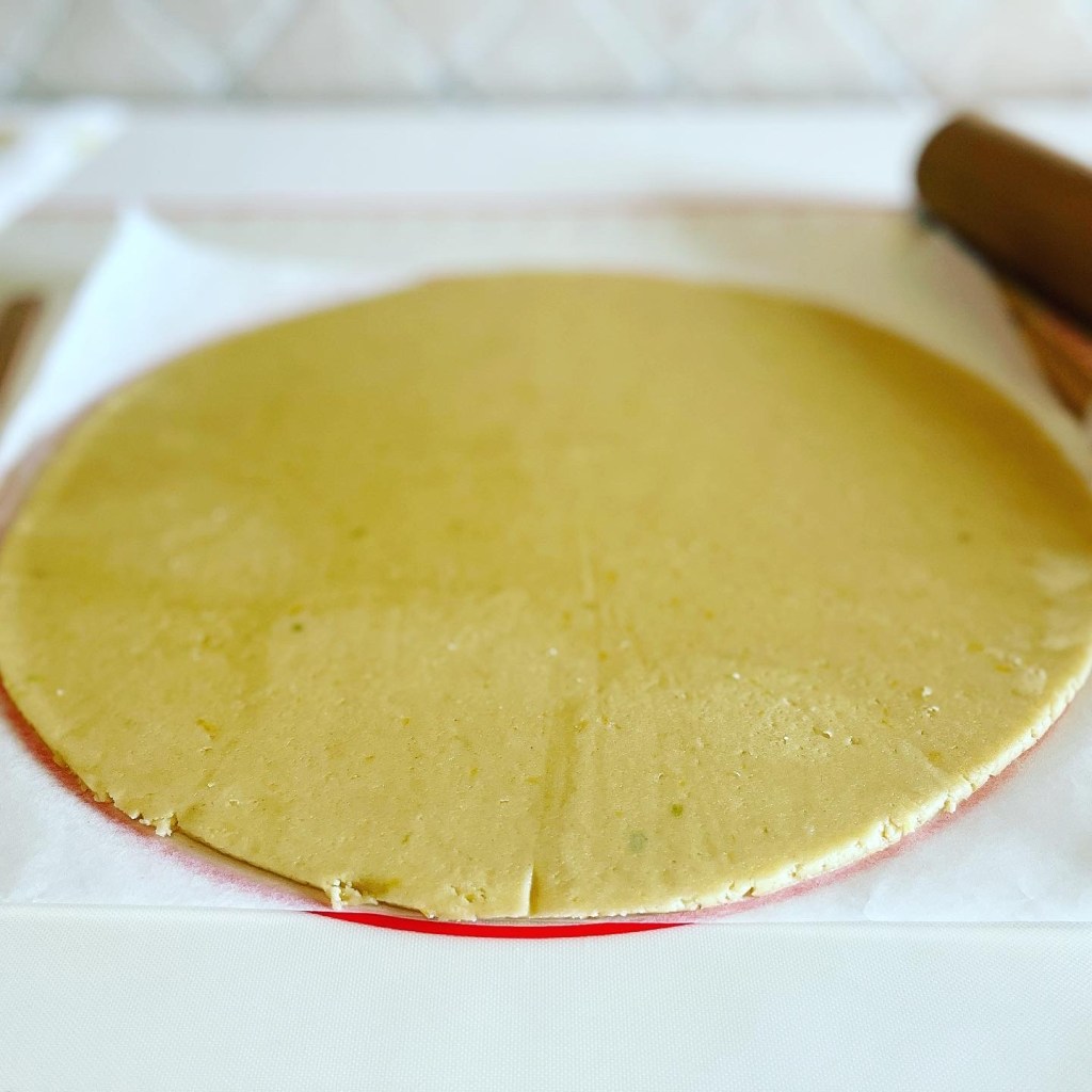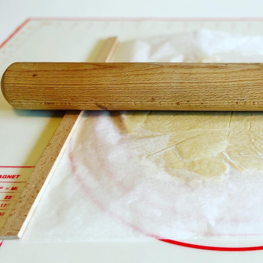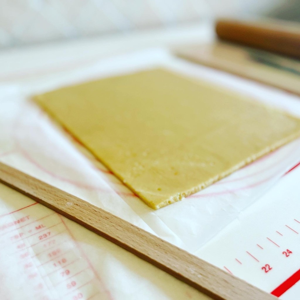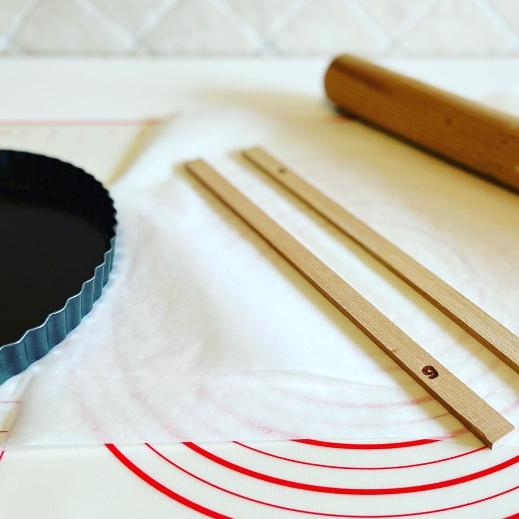 Il mio consiglio è quello di stendere la frolla tra due fogli di carta da forno, usando gli spessori di legno come guida per il mattarello, così da avere uno spessore uniforme.