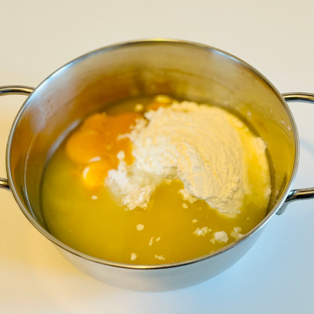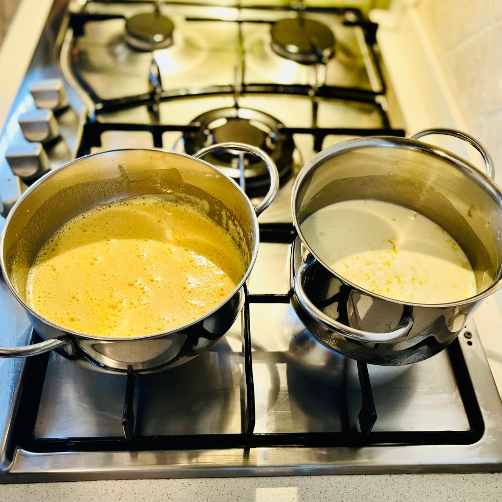 Gli ingredienti della ricetta vanno suddivisi in questo modo: nella prima pentola inserite il latte e la buccia di limone grattugiato; nella seconda pentola mettete tutti gli altri ingredienti, che andrete a mescolare vigorosamente fino alla completa liquefazione del preparato. Potete usare una frusta elettrica per facilitarvi il lavoro.