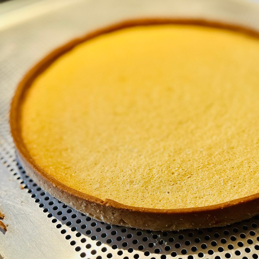 Nel giorno di preparazione della crostata si comincia realizzando il guscio di pasta frolla. Stendete la pasta frolla realizzando un disco per la base della crostata e delle strisce per il bordo (entrambi di 3 mm di spessore). Lasciate riposare entrambi gli strati di frolla per 60 minuti nel freezer e successivamente adoperateli per foderate l’anello microforato. La procedura è descritta nei minimi dettagli in questa scheda tecnica del sito, alla quale vi rimando per tutte le spiegazioni.