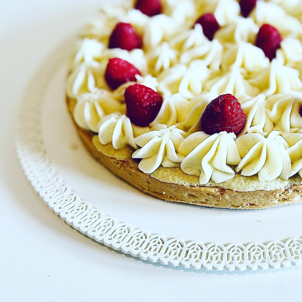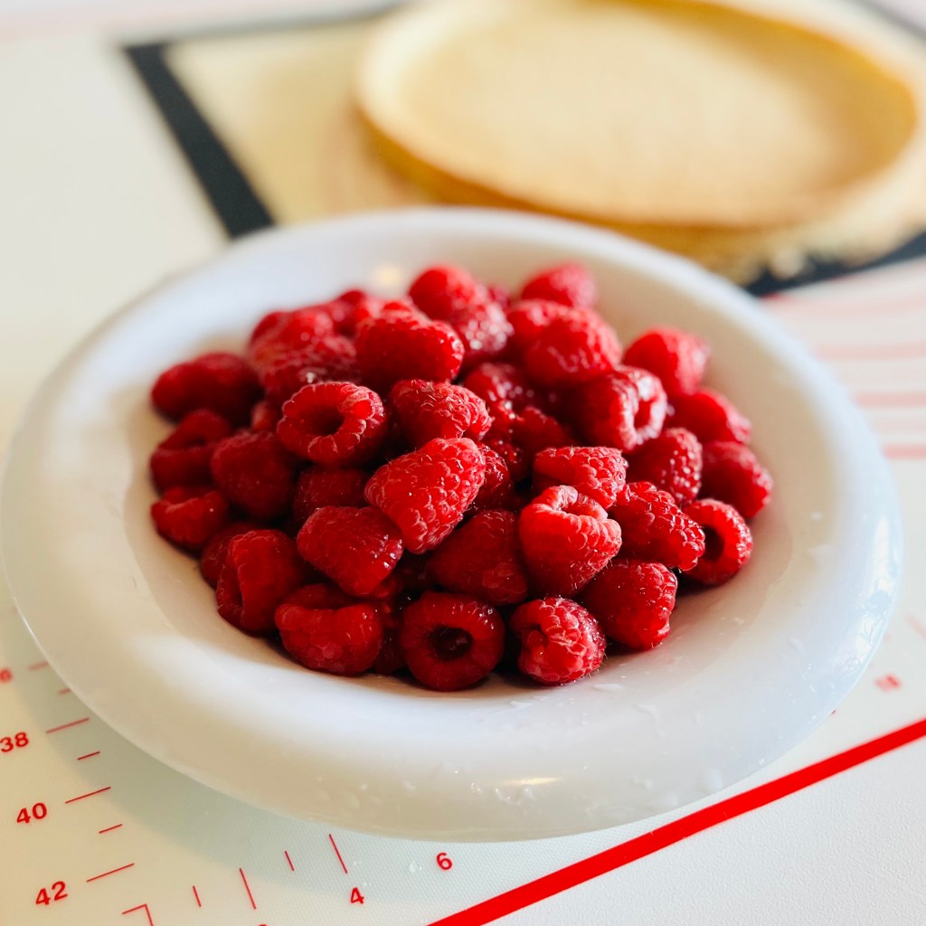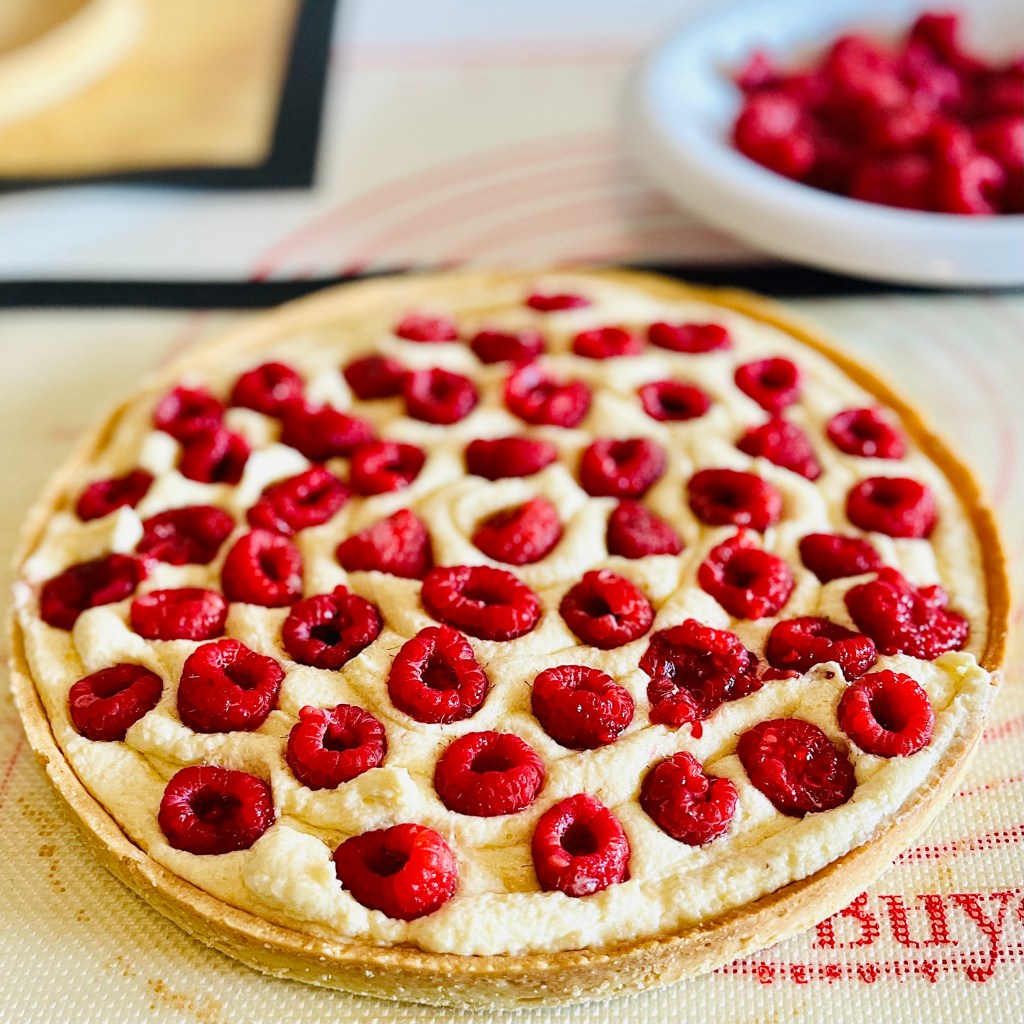 La base della crostata, farcita con cremoso e lamponi, va cotta per altri 18 minuti nel forno statico a 170 °C. Durante la cottura il volume del cremoso crescerà fino a superare leggermente il bordo della crostata; il livello si abbasserà un po’ dopo il raffreddamento. Al termine della cottura e del raffreddamento, l’obiettivo finale dovrebbe essere quello di avere la farcitura esattamente allo stesso livello del bordo della frolla.
