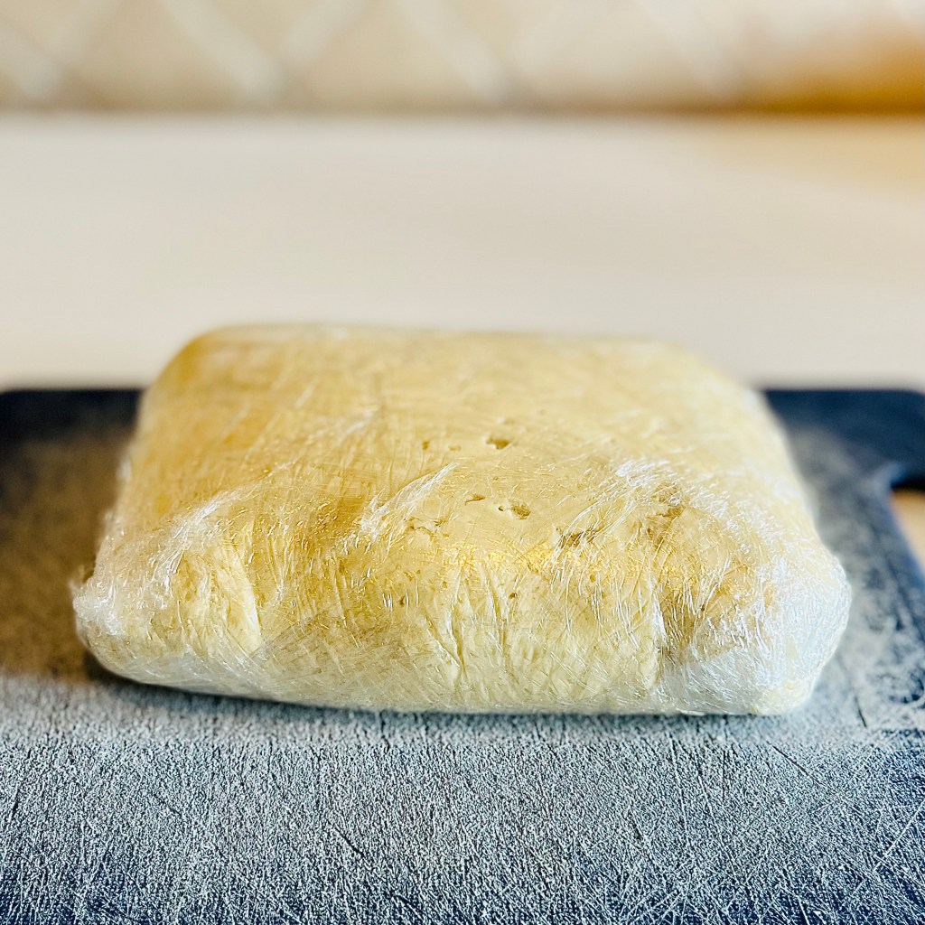 Una volta preparata la frolla, questa va messa a riposare in frigorifero per almeno una notte. Suggerisco di coprire il panetto di frolla con un foglio di pellicola di plastica trasparente.