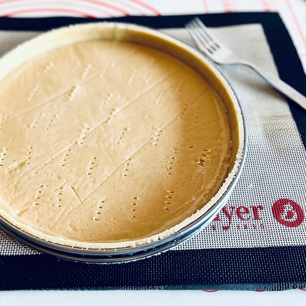 Nel giorno di preparazione della crostata si comincia realizzando il guscio di pasta frolla. Stendete la pasta frolla realizzando un disco per la base della crostata e delle strisce per il bordo (entrambi di 3 mm di spessore). Lasciate riposare entrambi gli strati di frolla per 60 minuti nel freezer e successivamente adoperateli per foderate l’anello microforato.