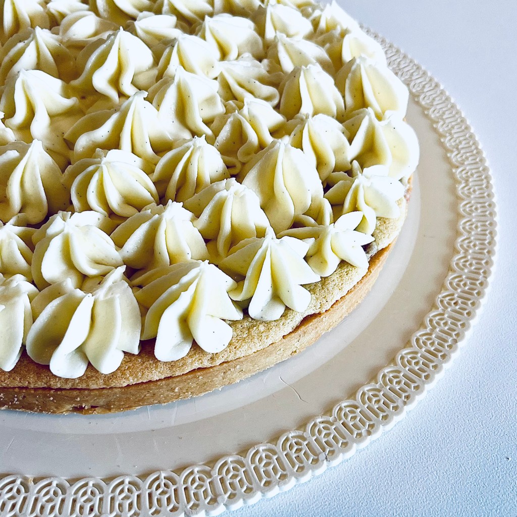 - una ganache montata al cioccolato bianco, che costituirà l’elemento principale della guarnizione della crostata. Esiste una scheda tecnica anche per questa preparazione.
