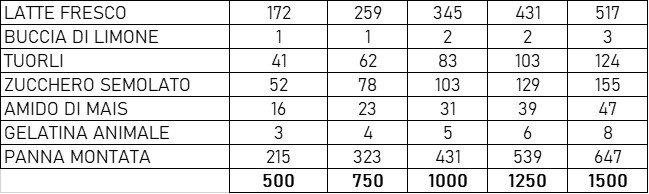 Le dosi di riferimento per quantità di Crema Diplomatica che variano da 500 a 1500 grammi sono riportate nella tabella che segue.