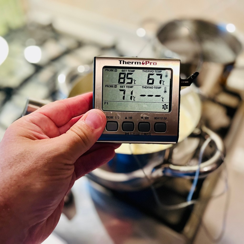 Per cuocere la crema si inizia portando il latte ad ebollizione; questo viene poi aggiunto alla crema di uova filtrandolo con il colino, così da trattenere la buccia di limone. A questo punto si mescolano gli ingredienti con una frusta e si comincia a scaldare la crema, controllando periodicamente la temperatura con il termometro. Per una crema ad opera d’arte dobbiamo interrompere la cottura ad 85 °C, così da evitare la formazione di grumi. A quel punto si spegne il fornello e si continua a mescolare vigorosamente per un paio di minuti per eliminare qualsiasi irregolarità nella crema.