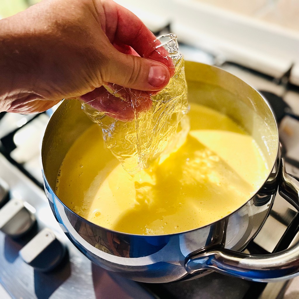 Il passo successivo è quello di aggiungere la gelatina. Si strizzano bene i fogli idratati e si aggiunge la gelatina direttamente nella crema pasticcera, mescolando bene fino a completo scioglimento.