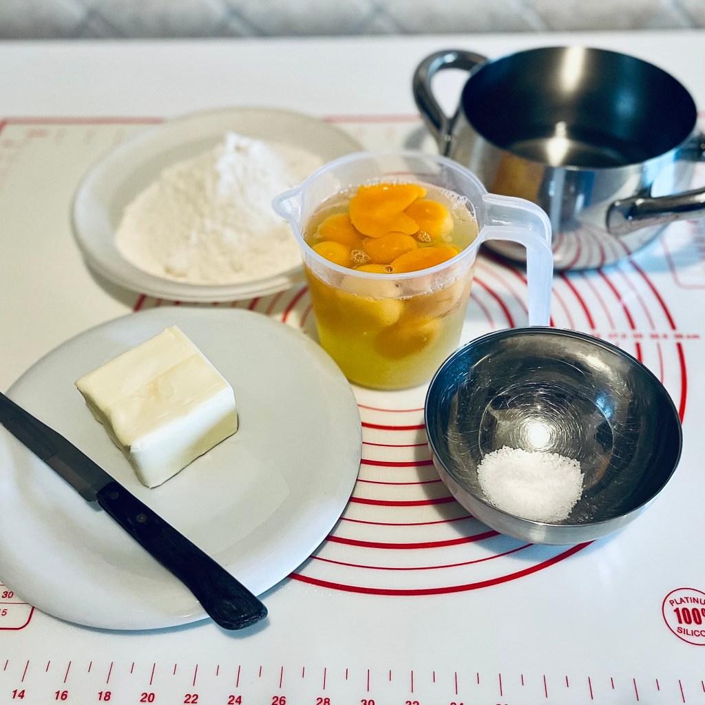 La pasta per i bignè richiede una prima cottura in pentola di acqua, burro, sale e farina. Si comincia facendo sciogliere il burro con acqua e sale e successivamente, dopo aver raggiunto il punto di ebollizione, si aggiunge la farina.