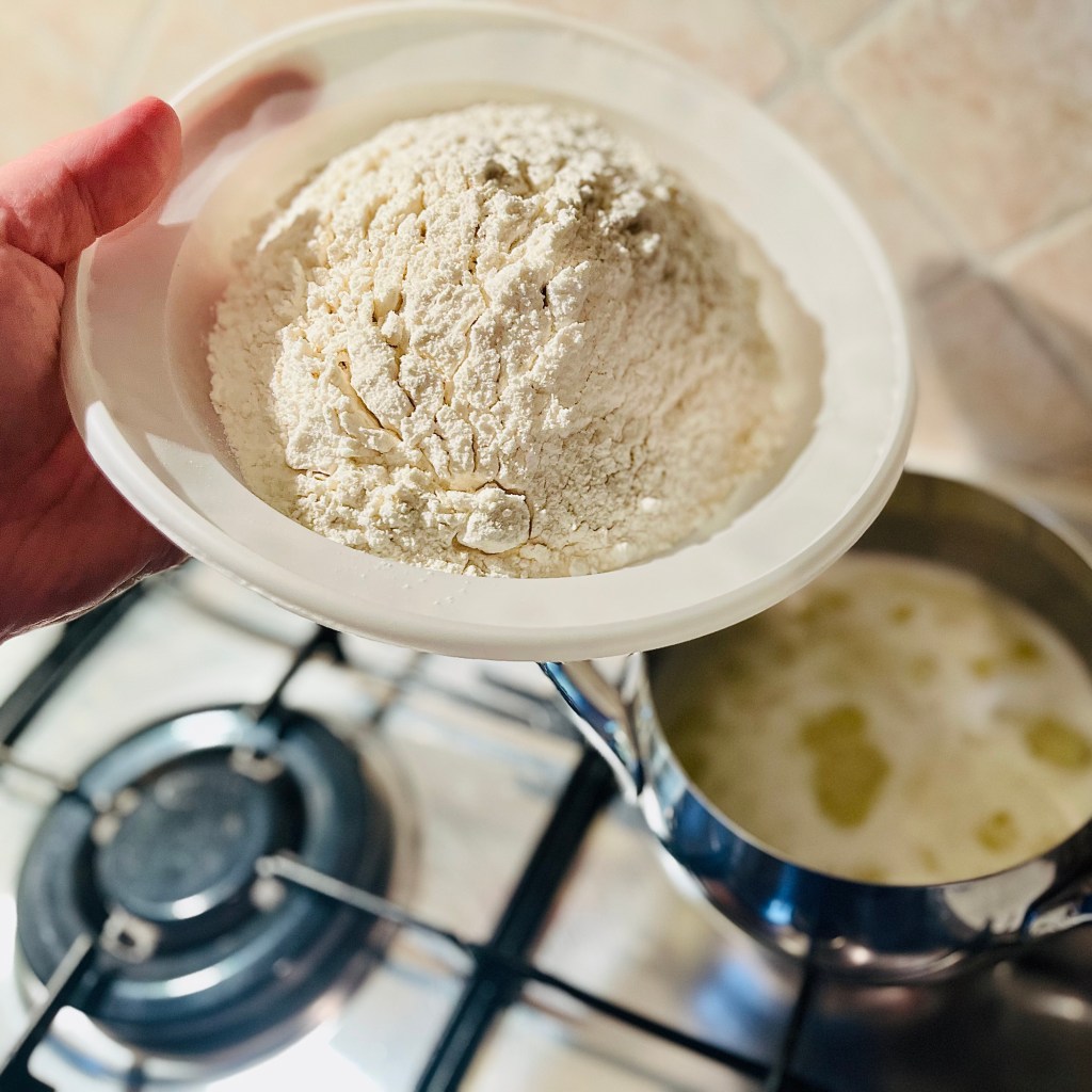 Una volta aggiunta la farina occorre mescolare energicamente e continuare a cuocere per alcuni minuti fino ad asciugare il tutto. Questa fase è molto importante in quanto necessaria per disidratare la pasta e per dare all’amido della farina una struttura molto fitta; il risultato sarà un bignè che sviluppa perfettamente in forno. La cottura della pasta è completa quando questa si stacca perfettamente dalle pareti e dalla base della pentola.