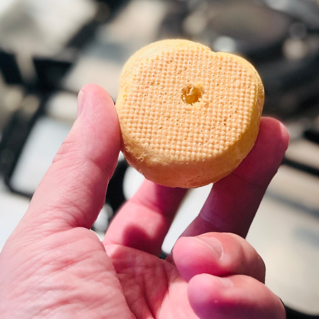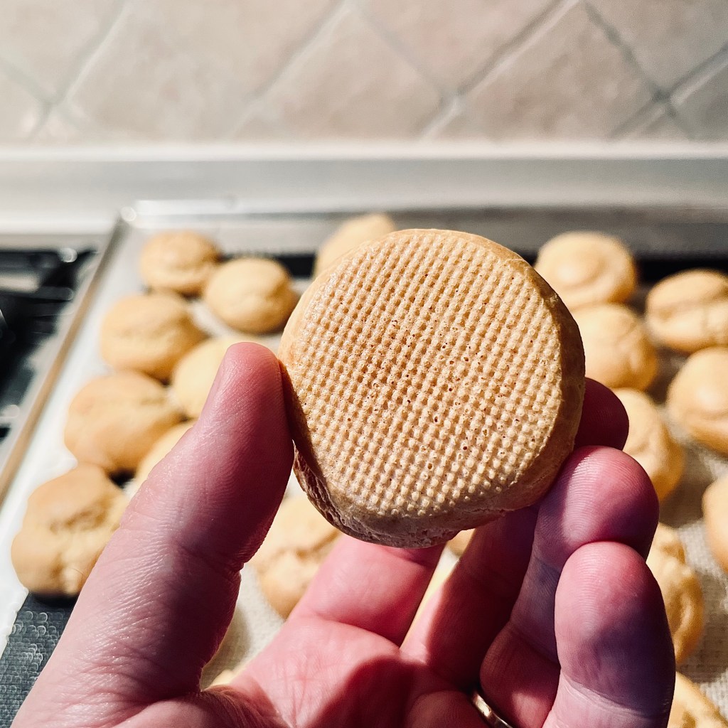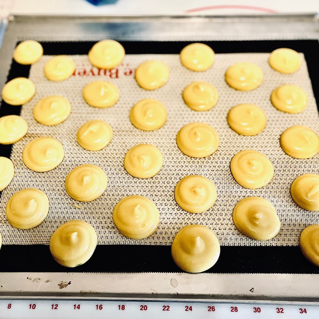 Con la sac-a-poche si realizzano delle semisfere di pasta distanziate in maniera uniforme. La pasta choux tenderà evidentemente ad afflosciarsi, ma se l’aggiunta delle uova è stata fatta in maniera corretta i bignè manterranno comunque una forma netta e una buona dimensione verticale. Il tappeto microforato ha anche il vantaggio di ridurre il fenomeno di scivolamento della pasta.