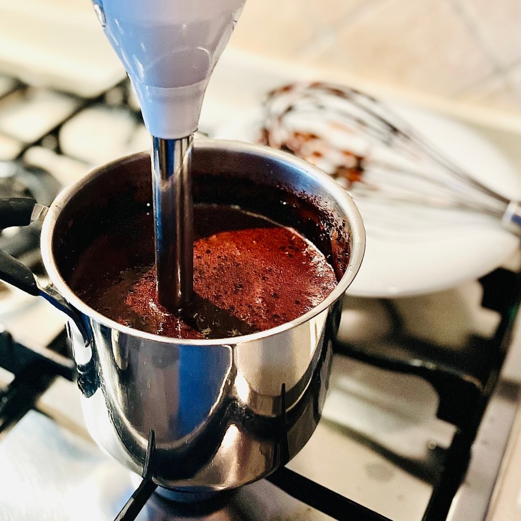 A questo punto si completa la fase di combinazione degli ingredienti frullando la glassa con un frullatore ad immersione. E’ opportuno mantenere la testa del frullatore ben immersa nella glassa ed evitare di incorporare bollicine d’aria.