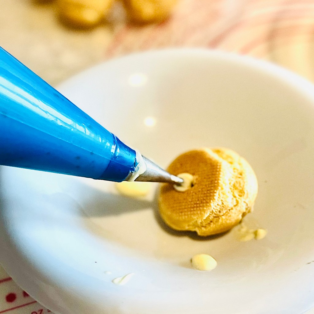 Per la farcitura si possono appoggiare i bignè su un piatto fondo, con la base rivolta verso l’alto, così da poter facilmente inserire il beccuccio della sac-a-poche e riempire il pasticcino di crema. Acquisita un pò più di dimestichezza, si può tenere il bignè con una mano e la sac-a-poche con l’altra, riempendo il pasticcino di crema senza necessità di appoggiarlo nel piatto.