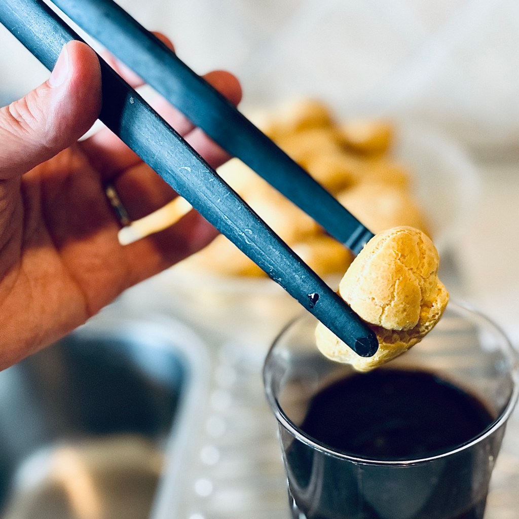 Prendiamo un bignè alla volta con la pinza di plastica, facendo attenzione a mantenere sempre il foro verso l’alto. Immergiamolo nella glassa, facciamo sgocciolare eventuali ecessi di crema e posizioniamolo sul vassoio, questa volta con il foro verso il basso.
