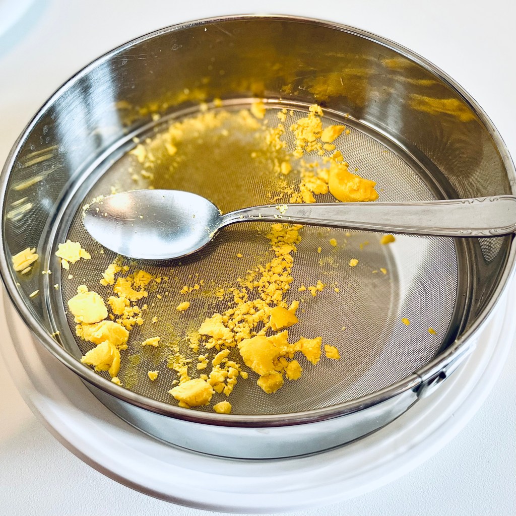 Per il tuorlo sodo si fanno bollire due uova per 8 minuti; dopo che queste sono raffreddate, si procede con delicatezza ad estrarre il tuorlo e a passarlo attraverso un setaccio a maglia fine, aiutandosi con un cucchiaio.