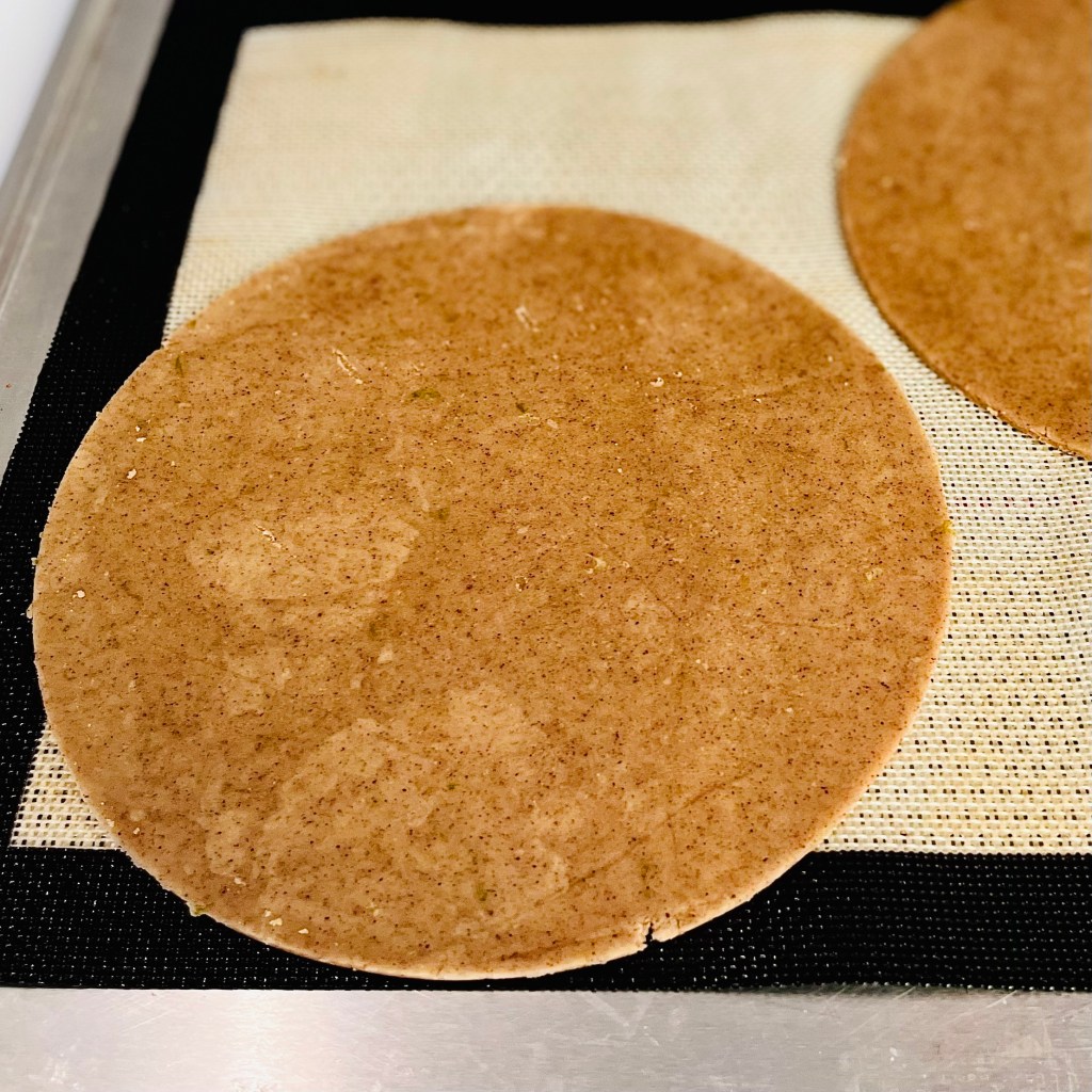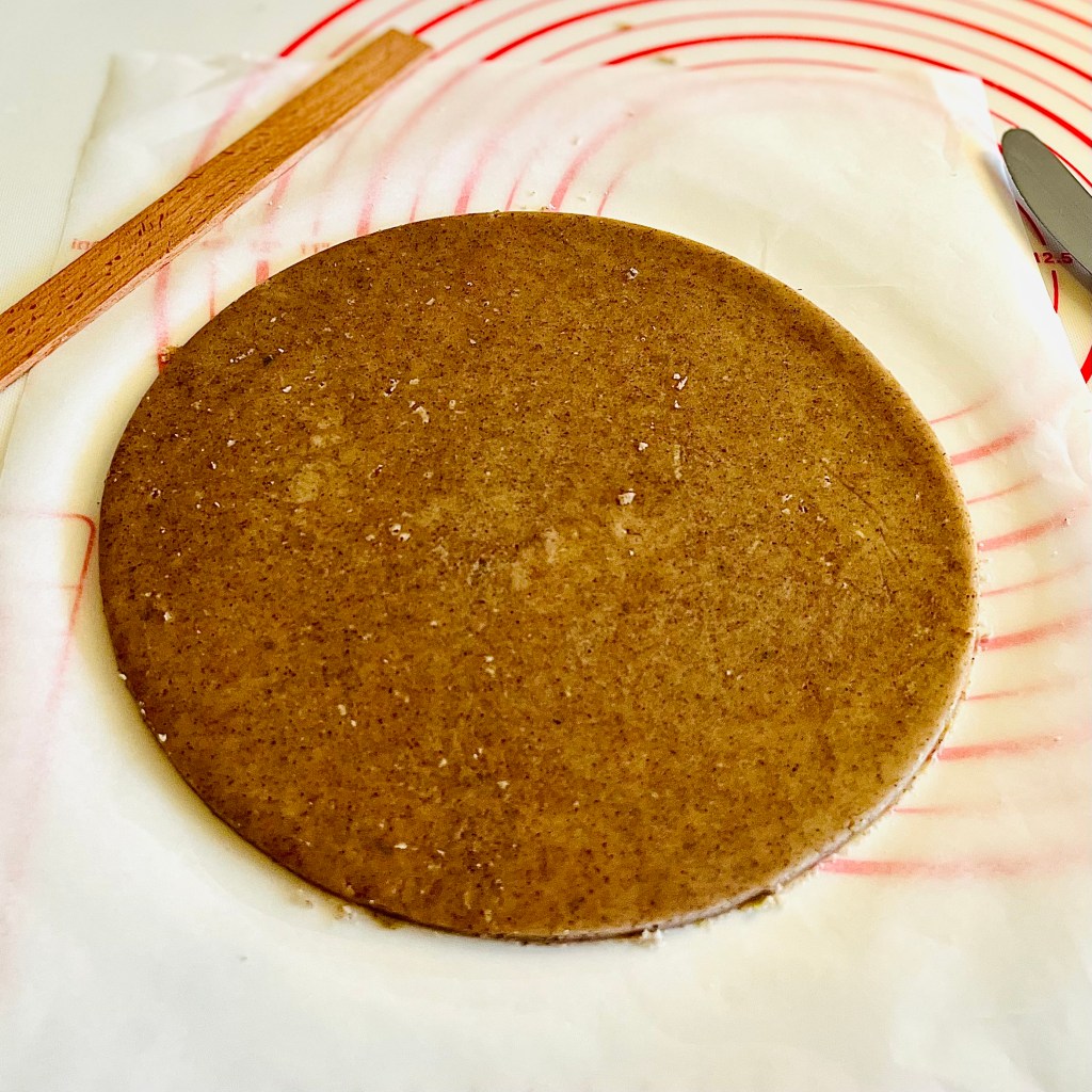La frolla ovis mollis va stesa in strati sottili, non superiori ai 3 mm. Suggerisco di utilizzare spessori di legno per un risultato perfetto. Con l’ausilio dell’anello da pasticceria, si toglie da ogni biscotto la frolla in eccesso. Occorre preparare cinque dischi, ognuno dei quali deve riposare almeno 15 minuti in frigorifero prima di essere cotto.