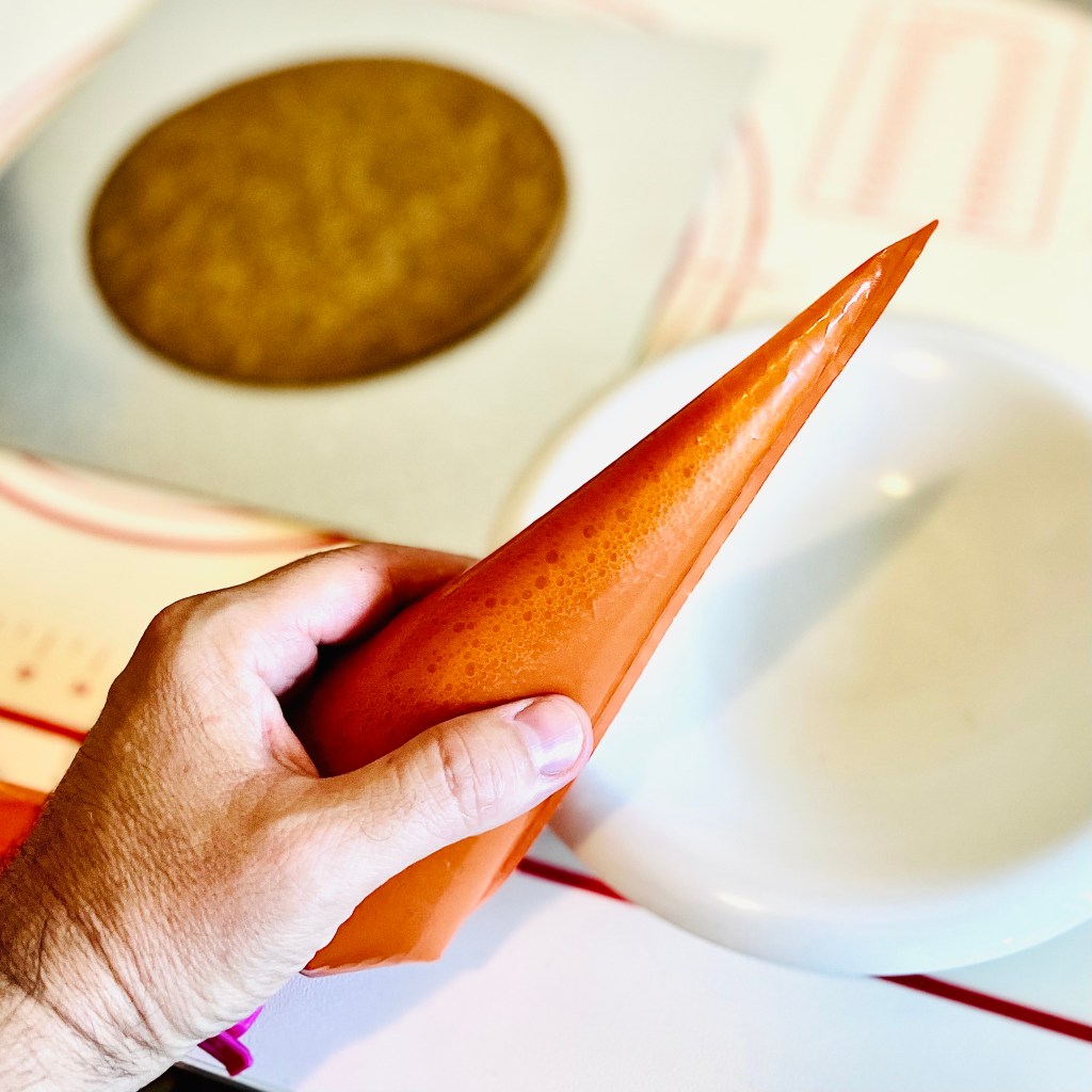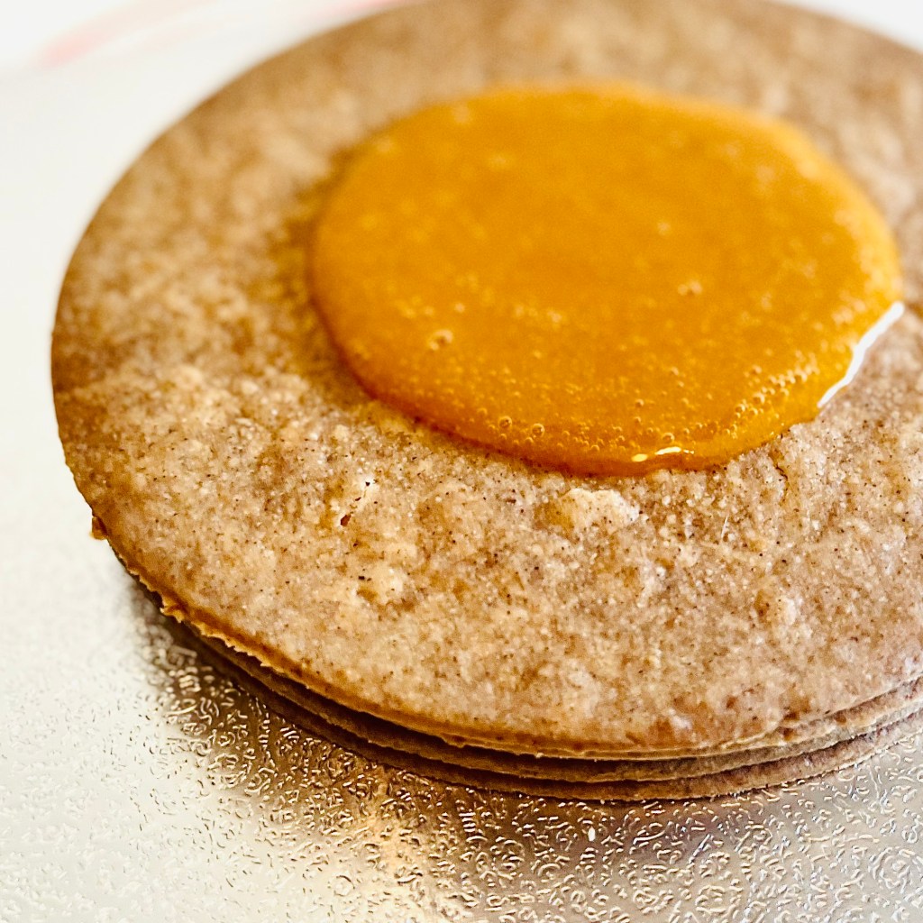 Per l’assemblaggio della crostata, si versa la confettura sul primo disco di biscotto, arrivando fino ai 2/3 del diametro.