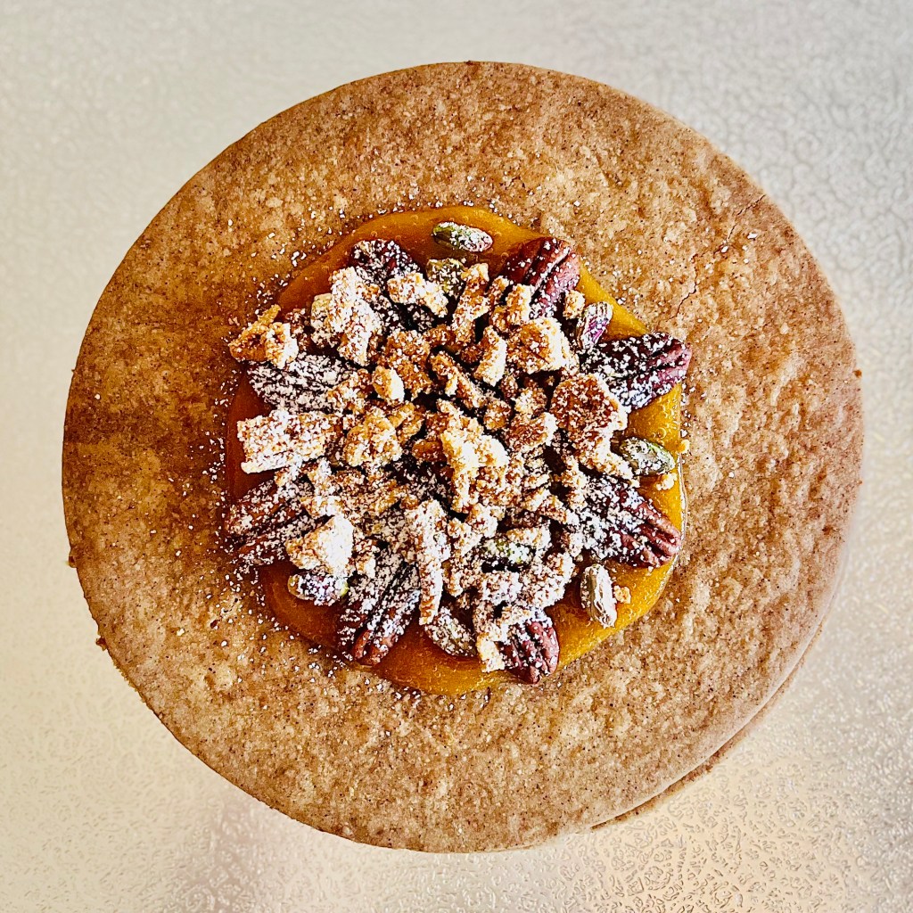 Per quanto riguarda lo streusel, questo generalmente viene realizzato in grandi quantità sotto forma di un panetto (come spiegato in questa scheda); dal panetto ricaveremo un piattino di briciole che verrà adoperato per la guarnizione della crostata, assieme ad una manciata di pistacchi e noci pecan.