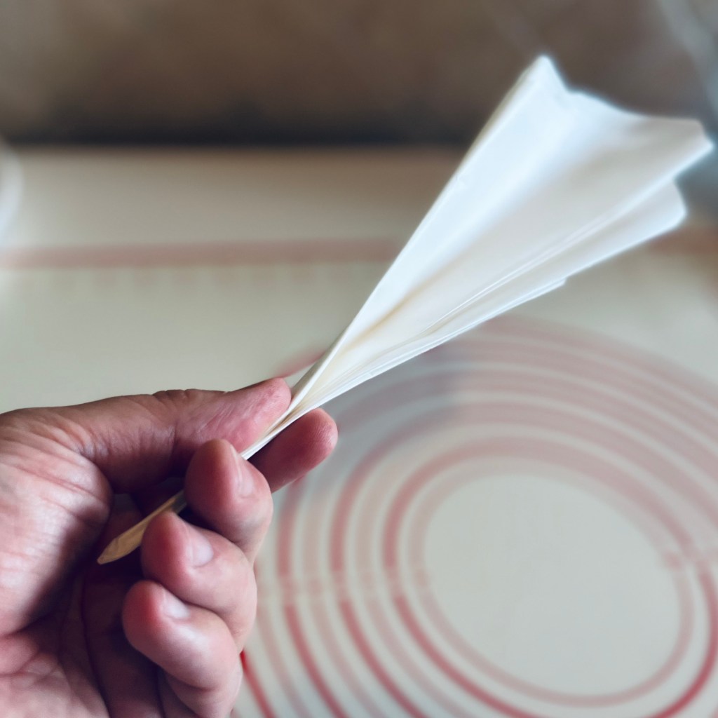 Al termine di questa procedura si sarà ottenuto un foglio appuntito e sottile di carta da forno.