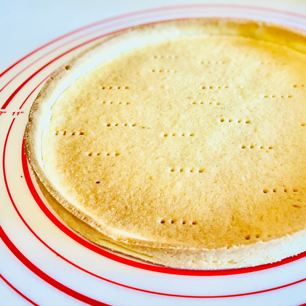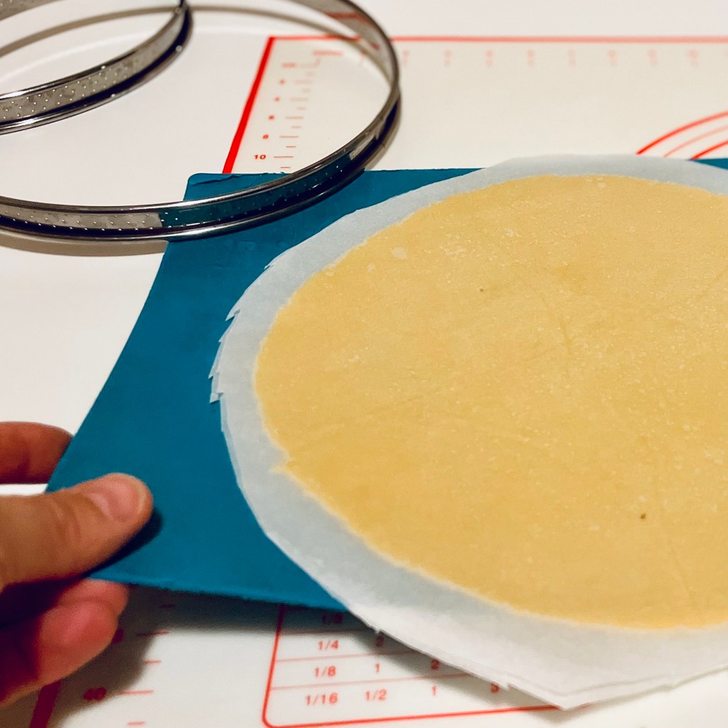 In sintesi, si tratta di stendere un disco e un rettangolo di frolla spessi 3 mm, che andranno prima lasciati riposare in freezer per 60 minuti, quindi utilizzati per foderare l’anello microforato imburrato.